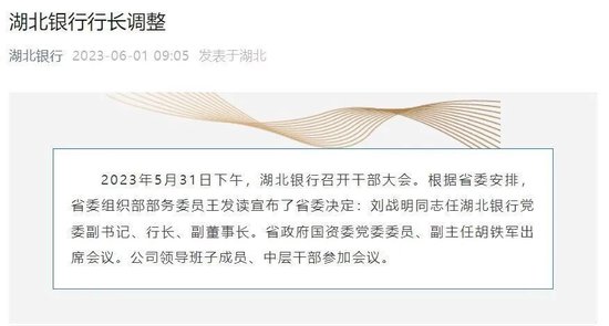6月1日,湖北银行发布公告称,2023年5月31日下昼,湖北银行召开干部大会。凭据省委安排,省委组织部部务委员王发读晓谕了省委决定:刘战明同道任湖北银行党委副通知、行长、副董事长。凭据湖北省委组织部5月21日发布的拟任职干部情况公示,刘战明1972年5月生,在任大学,法律硕士,中共党员。现任长江产业投资集团有限公司党委委员、副总司理。