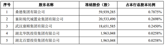 罢了2022年7月15日,湖北银行10户推进所抓有的股份存在冻结情况,上述冻结股份总和为1.07亿股,占总股本的1.41%。其中最大的被冻结推进为桑德集团有限公司,被冻结近6000万股,占总股本比例约0.79%。而这次被拍卖的武汉康顺集团位列第三,碰劲抓有1865万股,占湖北银行总股本的约0.25%。