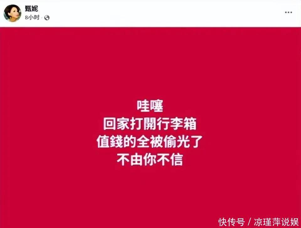 曾演唱过《射雕好汉传》主题曲《铁血忠心》的闻明女歌手甄妮,7月17日在个东说念主应付平台上发文称:“哇噻,回家通达行李箱,值钱的全被偷光了,不由你不信。”