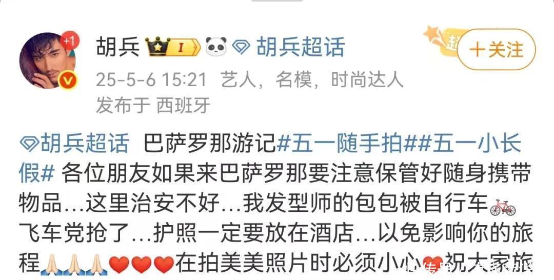 5月6日,演员胡兵在个东说念主应付平台上发文称,“诸位一又友若是来巴塞罗那要注视撑抓好随身捎带物品……我发型师的包包被自行车飞车党抢了。”