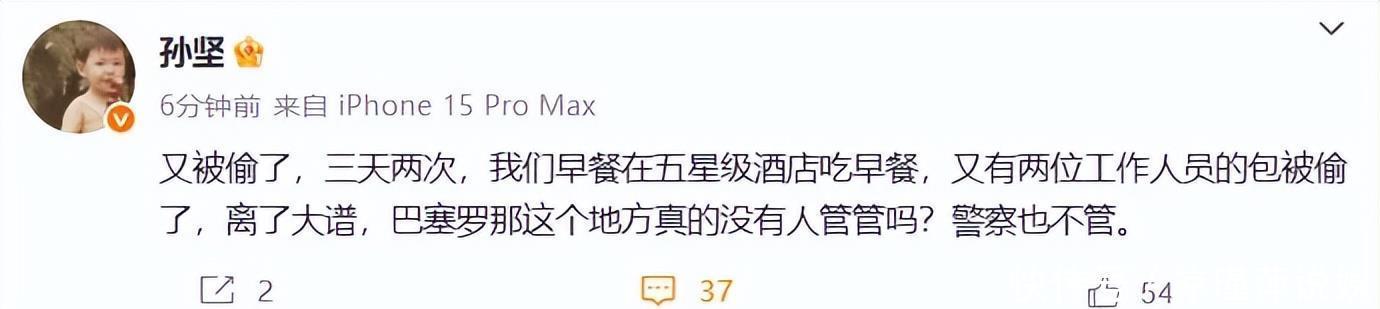 4月24日,演员孙坚公布在西班牙被偷包的监控画面,3天被偷2次,叱咤:巴塞罗那这个所在莫得东说念主宰管吗?